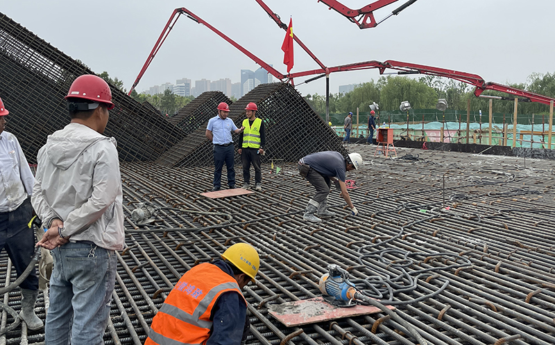 據悉,廣德路跨南淝河橋的關鍵節點主橋8號承臺,采用不規格的矩形切角型,其承臺下設46根鉆孔灌注樁基礎,設計總砼澆筑方量8869.2m3,本次澆筑方量4198m3。因整體澆筑體量大、技術要求標準高,為保障工程質量,項目部精心組織、科學謀劃,編制《大體積混凝土專項施工方案》并經專家多次研討論證通過。澆筑前項目部全力協調人、材、機配給,對現場安全施工標準、鋼筋制作綁扎、預埋件及冷卻管布設、施工及養護措施等進行了詳細技術交底,將任務分解到人,責任落實到人,扎實做好各項準備工作,以確保澆筑工作萬無一失。